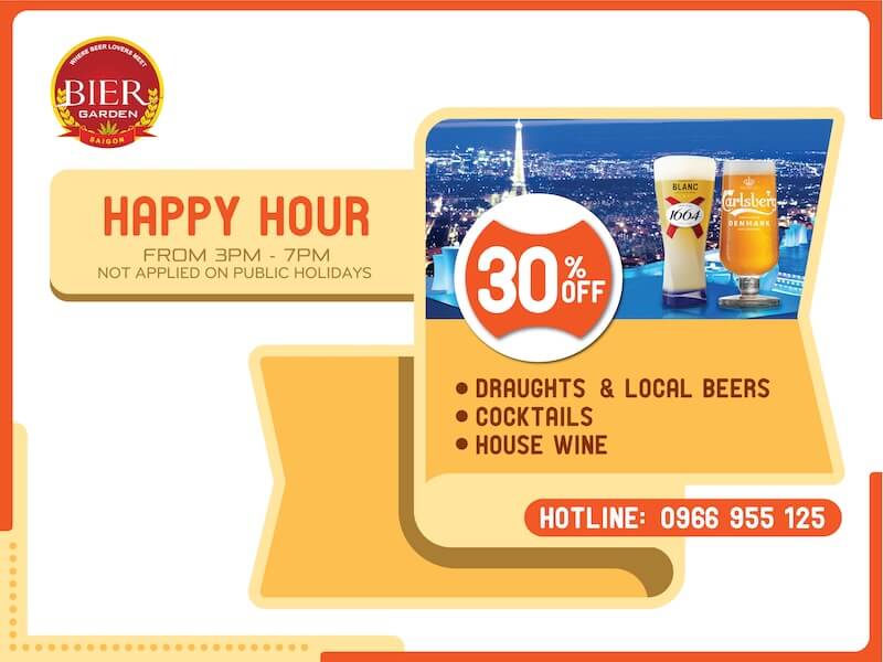 Giảm giá 30% Draughts, Local Beers, Cocktails & House Wine.
