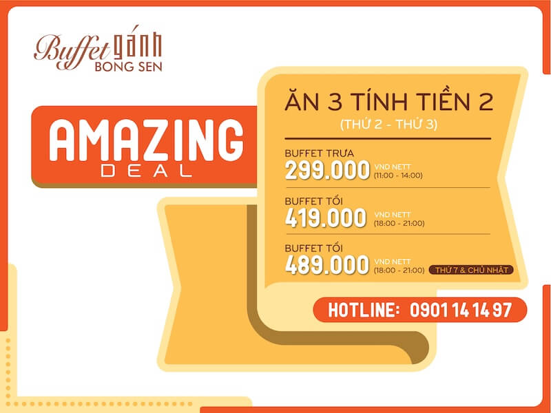 ĂN 3 TÍNH TIỀN 2, áp dụng Thứ 2 & Thứ 3 hàng tuần (không áp dụng ngày Lễ, Tết và các chương trình khuyến mãi, deal khác)