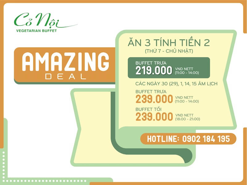 ĂN 3 TÍNH TIỀN 2, áp dụng thứ 7, chủ nhật hàng tuần (không áp dụng ngày Rằm mùng 1, 14, 15, 30 Âm Lịch, Lễ, Tết và các chương trình khuyến mãi,...
