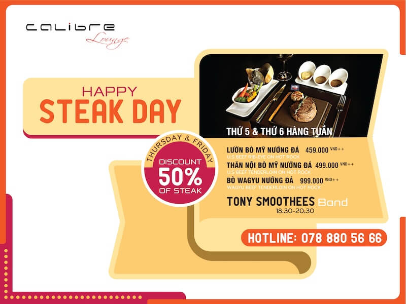 Thứ 5 & Thứ 6 hàng tuần, đừng bỏ lỡ cơ hội thưởng thức 3 món Steak hảo hạng tại Calibre Lounge – Lầu 1 với mức giá chỉ bằng nửa: